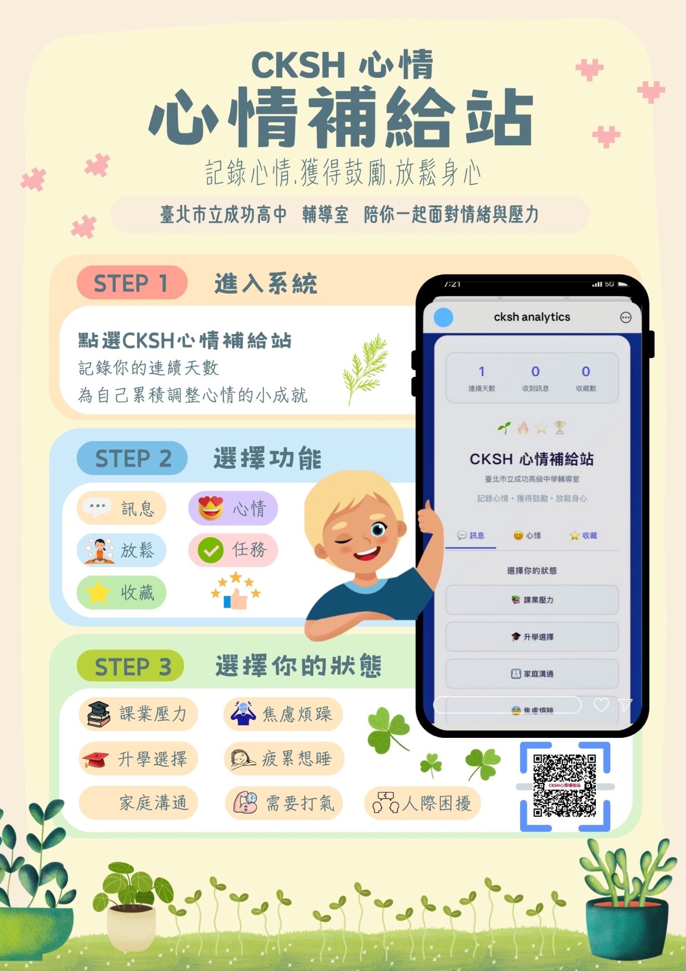 高中生活充滿挑戰,無論是課業壓力、升學焦慮、人際關係或家庭溝通,每個人都可能遇到情緒低落、壓力爆表的時刻。但有時候,我們需要的只是一個安全的空間,能夠記錄心情、獲得鼓勵、學習放鬆。「CKSH心情補給站」打造的數位心理健康平台,隨時隨地陪伴青少年面對各種情緒起伏。