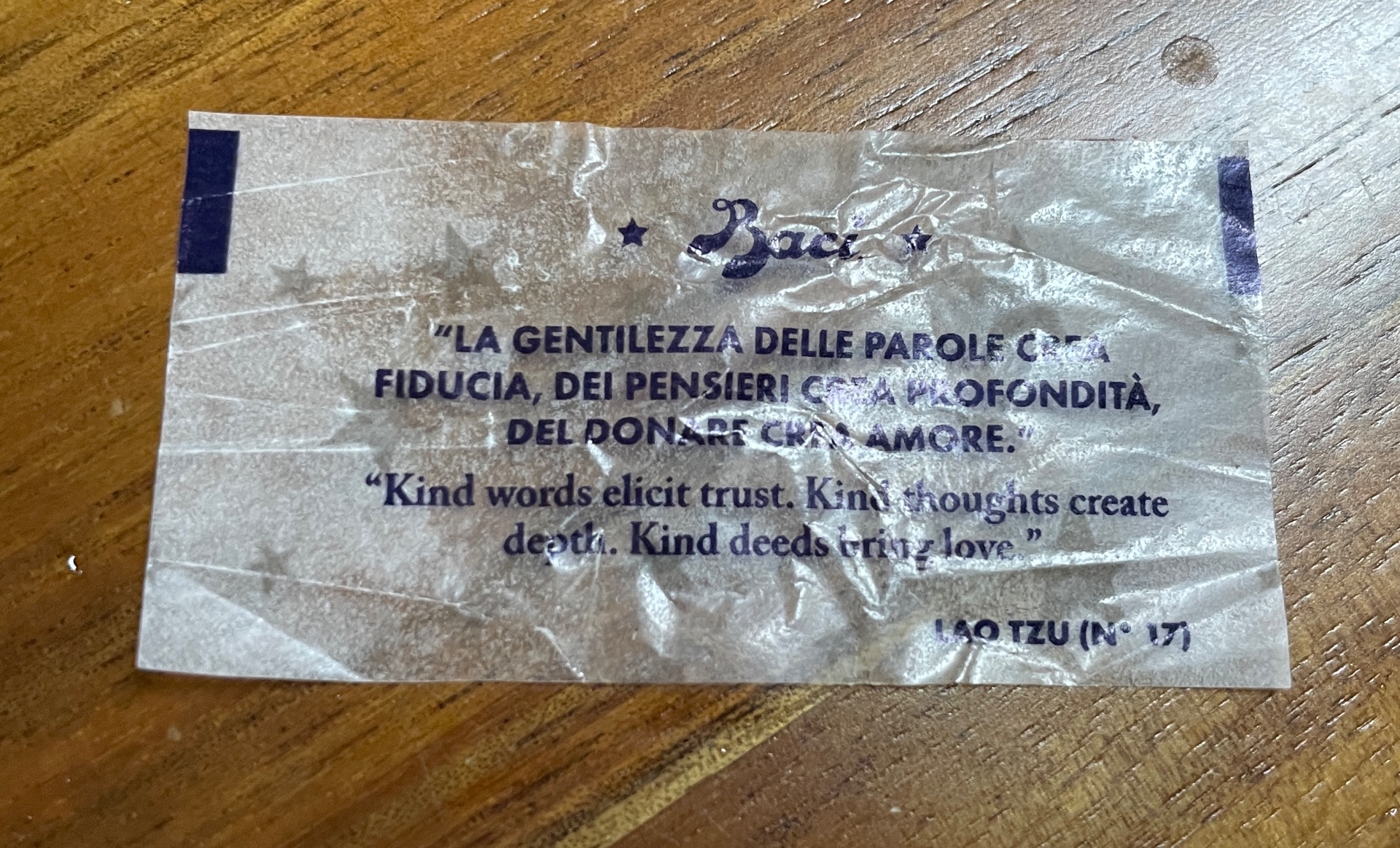 底部標註是 LAO TZU (N° 17),表示這句話出自老子,是第17號語錄。這是一句關於善良力量的智慧名言,說明了善良在言語、思想和行為三個層面,話語帶來信任、思想帶來深度、行為帶來愛。