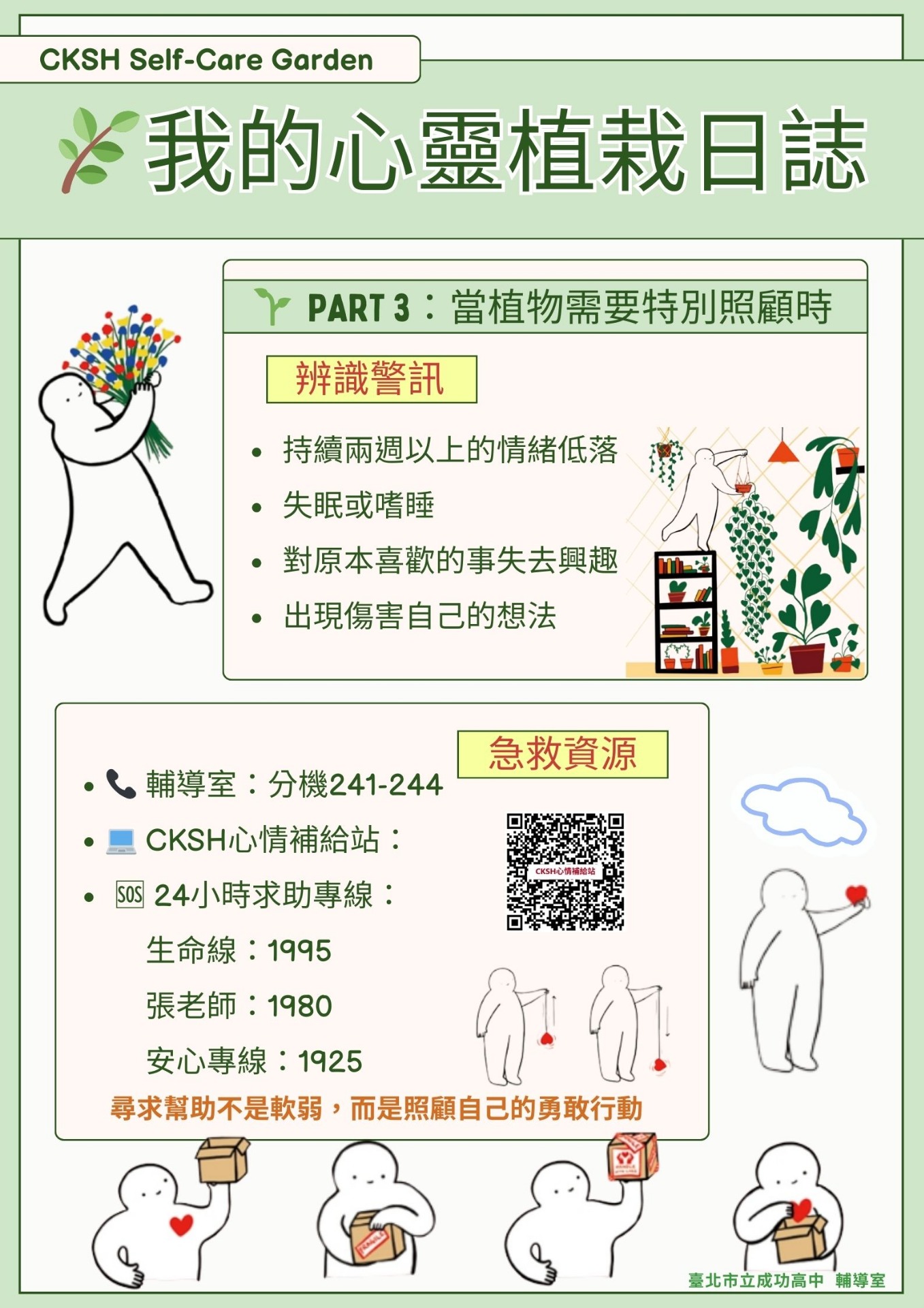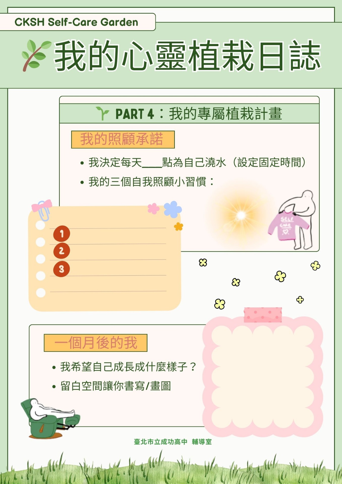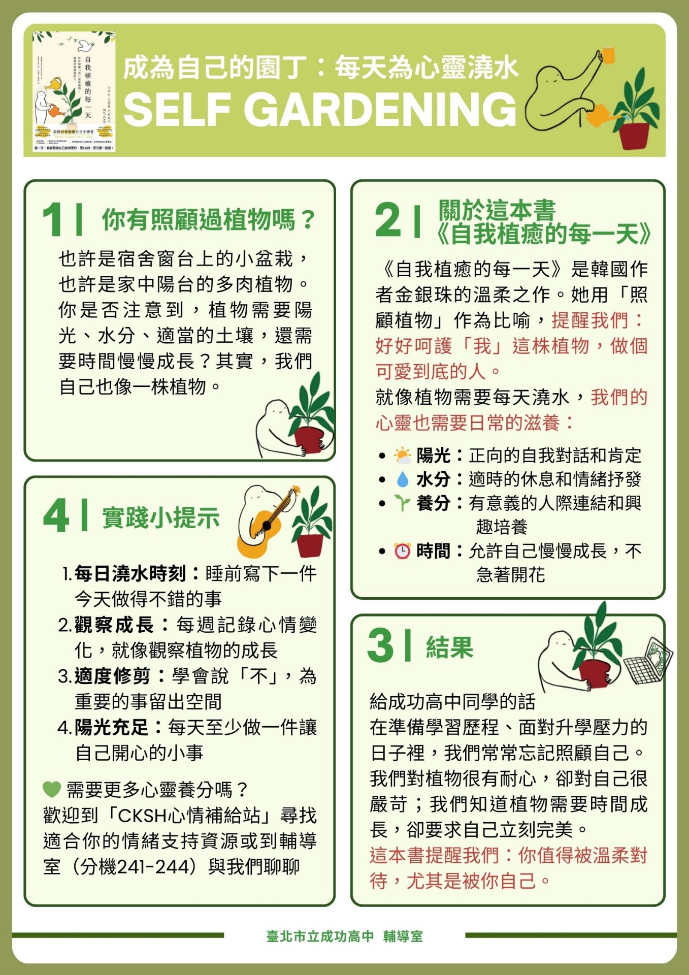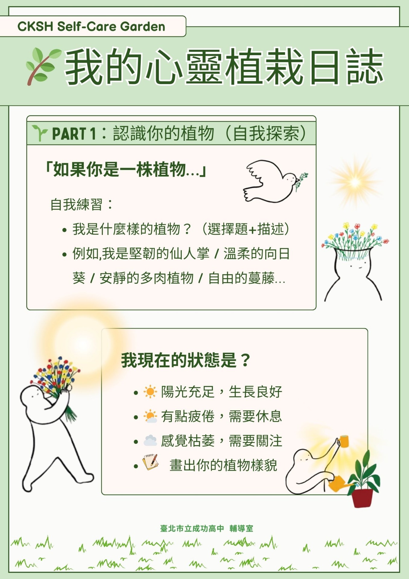 另一方面,我也將此書的精神應用在我的輔導工作中,這個「自我照顧如同照顧植物」的概念是很好的隱喻,可以幫助學生理解心理健康需要日常的滋養和關注。因此我除了自己閱讀,也決定推薦給學生。接下來我將此書的其中重點,挑出適合學生的輔導策略,著手寫出輔導刊物,並設計系列心靈植栽日誌,讓讀者為自己的心靈澆水與獲得滋養。